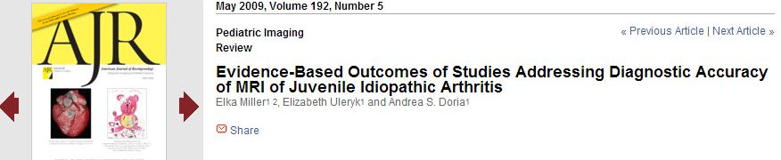 • Evidence-based outcomes of studies addressing diagnostic accuracy of MRI of juvenile idiopathic arthritis - http://www.ajronline.org/doi/abs/10.2214/AJR.08.2304