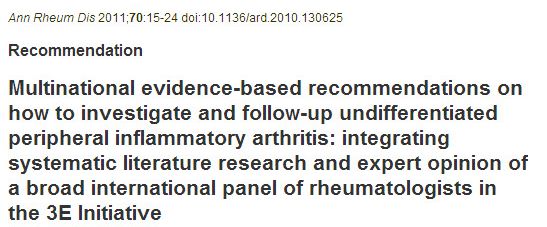 • Multinational evidence-based recommendations on how to investigate and follow-up undifferentiated peripheral inflammatory arthritis: integrating systematic literature research and expert opinion of a broad international panel of rheumatologists in the 3E Initiative - http://ard.bmj.com/content/70/1/15.short