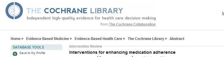 • Interventions for Enhancing Medication Adherence. Cochrane Review. published November 20, 2014 - http://onlinelibrary.wiley.com/doi/10.1002/14651858.CD000011.pub4/abstract.
